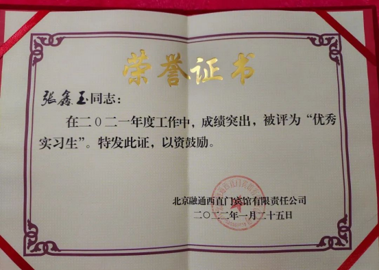 在北京融通西直门宾馆2021年度优秀表彰中,公司实习生张鑫玉被评为“优秀实习生”。实习结束后,她选择留下来继续为两会服务,在十三届全国人大五次会议接待服务工作中,表现突出,获得了酒店方及与会代表的一致好评。
