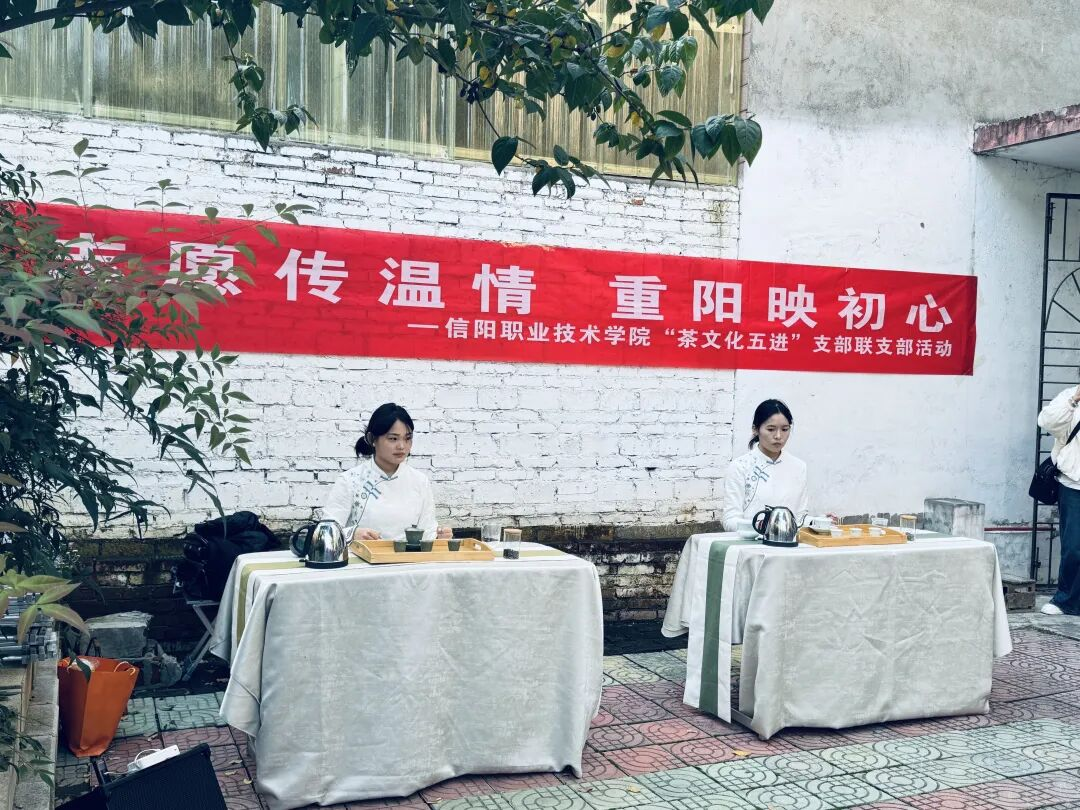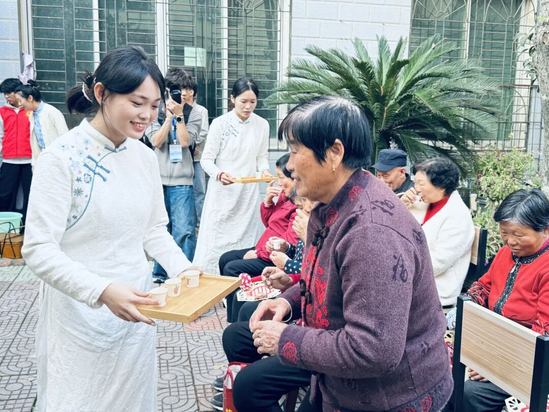 活动现场,同心社的入党积极分子们化身 “暖心使者”。他们手捧精心挑选的节礼点心,挨个儿走到老人身边,轻声送上节日祝福。一杯杯温润的茶汤递到老人手中,“爷爷您慢喝,这茶口感比较柔和”“奶奶小心烫”,细致的叮嘱让老人心中暖意更甚。一位老奶奶品着茶笑着说:“这茶好喝,孩子们更贴心,今天真是太开心了!” 氤氲茶香间,青春朝气与暮年祥和完美交融,成为重阳佳节里最动人的画面。