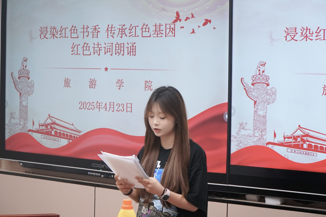 比赛现场,同学们以声传情、以韵明志。《沁园春·雪》豪迈大气,尽显革命者胸怀天下的壮志;《囚歌》情感真挚,重现革命志士坚贞不屈的精神;《七律·长征》音韵铿锵,展现红军战士的英勇无畏;《清平乐·六盘山》慷慨激昂,抒发解放军的凌云壮志;《卜算子·咏梅》格调昂扬,展现出游击队伍坚贞不屈的精神风貌。