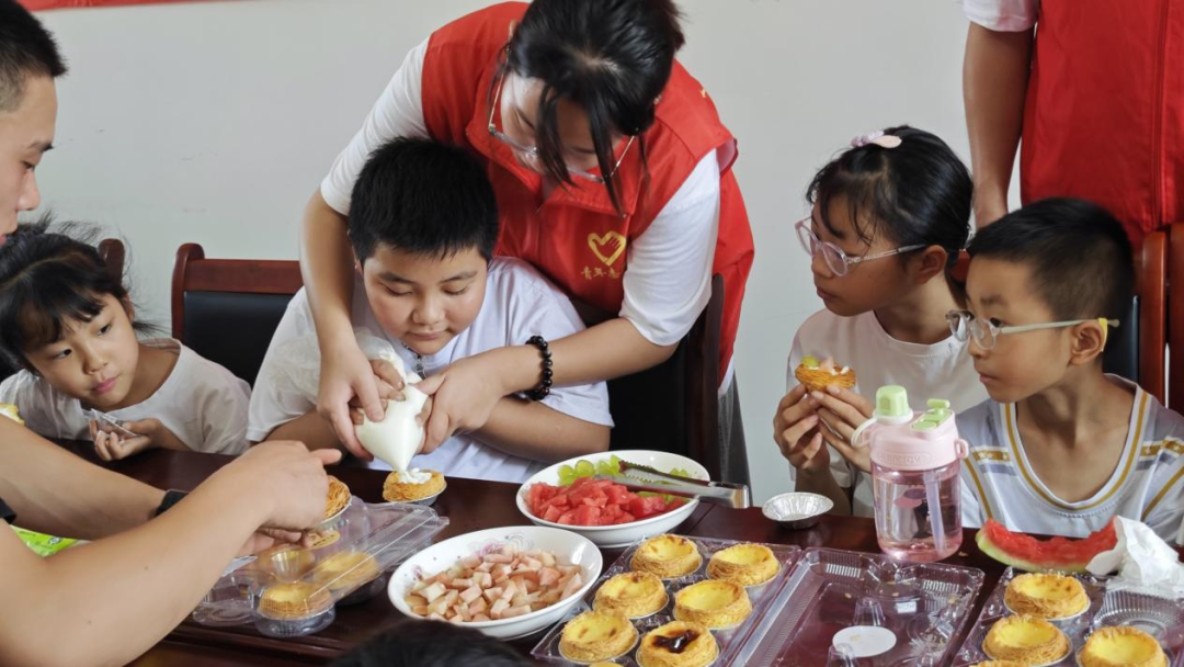 志愿者们参观并体验乡村养鹅产业,近距离感受乡村经济的活力。孩子们在志愿者的帮助下小心翼翼地切着水果、挤着奶油,亲手制作香甜蛋挞。“放飞烦恼”心理疗愈中,纸飞机带着孩子们的烦恼飞向远方。