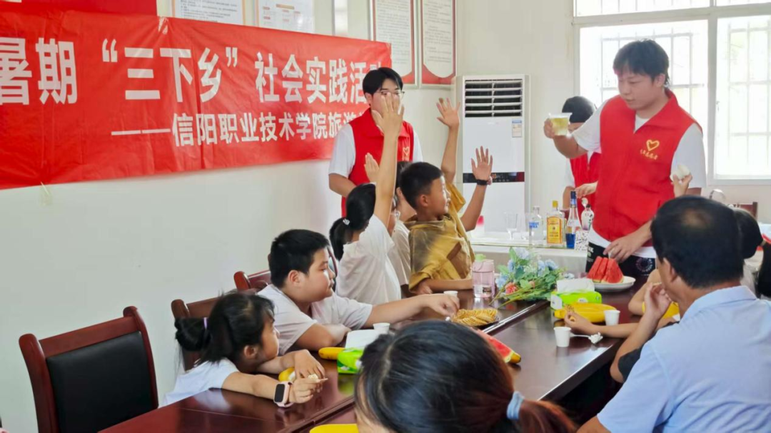 志愿者结合思政教育讲解大别山精神,让小朋友上台用普通话分享理解;还带他们模拟“旅游带团”,用普通话讲解村中风景,提升表达能力与家乡热爱。