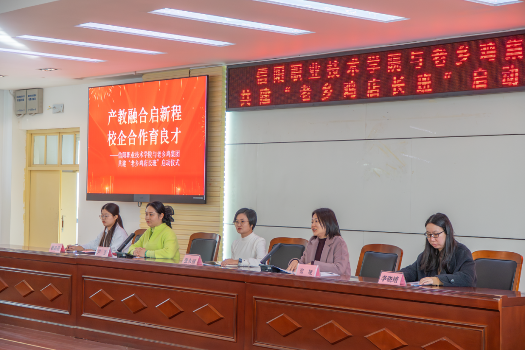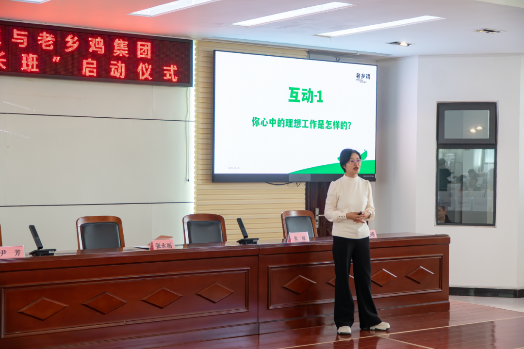 仪式上,张娅介绍了“老乡鸡店长班”组建意义及主题分享、互动答疑、申请报名三大核心环节;尹芳详细解读了老乡鸡的品牌成就与发展理念,宣布设立专项奖学金奖励店长班优秀学子,并寄语同学们珍惜机遇、勤学好思、勇追职业目标。