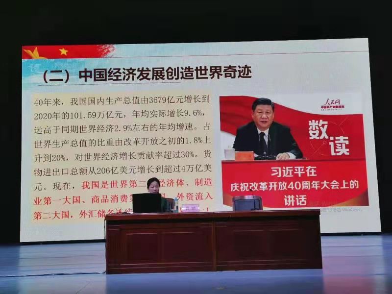黄鹂老师从社会主义制度在中国的建立、中国特色社会主义的伟大成就和中西对比彰显社会主义制度优势等三个方面,讲授了社会主义在中国的艰辛发展、曲折历程到奋进强大的整个过程和改革开放在政治、经济、文化等各方面取得的重大成就,不断用一幅幅生动的画面和一组组精准的数字阐述了“社会主义为什么好”这一鲜明的主题。