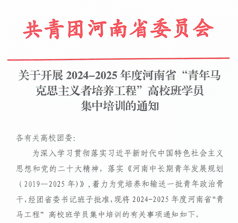 近日,共青团河南省委员会公布2024—2025年度河南省“青年马克思主义者培养工程”高校班学员名单。本次“青马工程”高校班共面向全省高校本专科员工和研究生遴选100名优秀学员,经过校内审核、选拔、推荐,团省委统一笔试、面试等遴选程序,公司304永利集团员工会执行主席周雪同学成功入选。