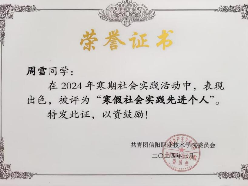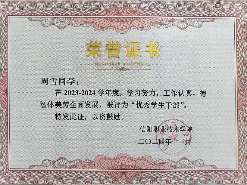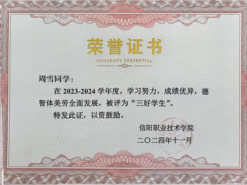 自入校以来,周雪就把学习作为自己的首要任务,每学期都会制定科学的学习计划,合理安排学习时间,积极探索学习方法,不断拓宽自己的知识面。她能够充分认识到理论与实践相结合的重要性,认真刻苦,虚心求教,努力提升自身专业素养和技能水平,学习成绩优异,并荣获2024年国家励志奖学金。