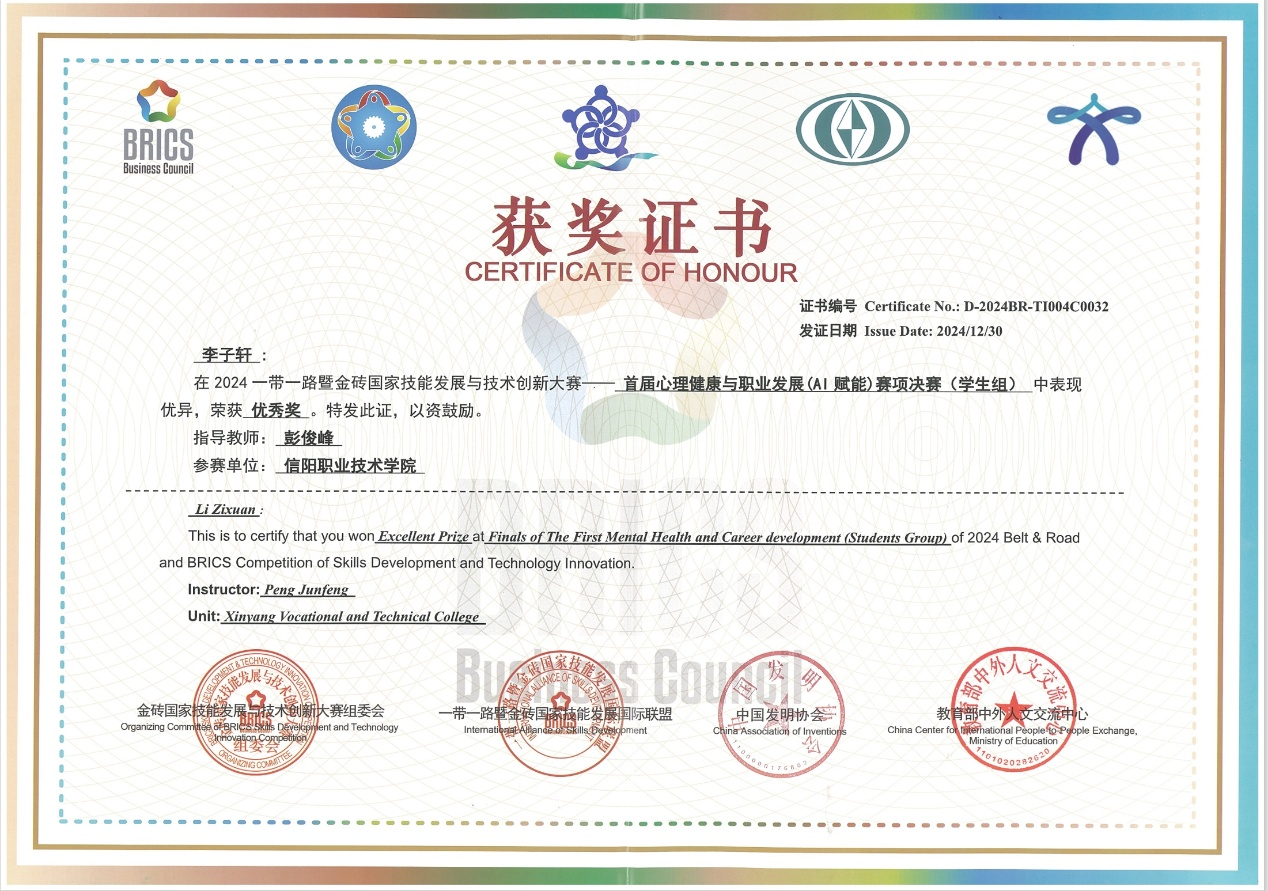 在专注旅游管理专业学习的同时,我勇于突破舒适圈,报名参加了2024年一带一路暨金砖国家技能发展与技术创新大赛首届心理健康与职业发展(AI赋能)赛项。面对这一跨领域的赛事,心理学与职业发展的专业知识如同陌生的高山,等待我去攀登。