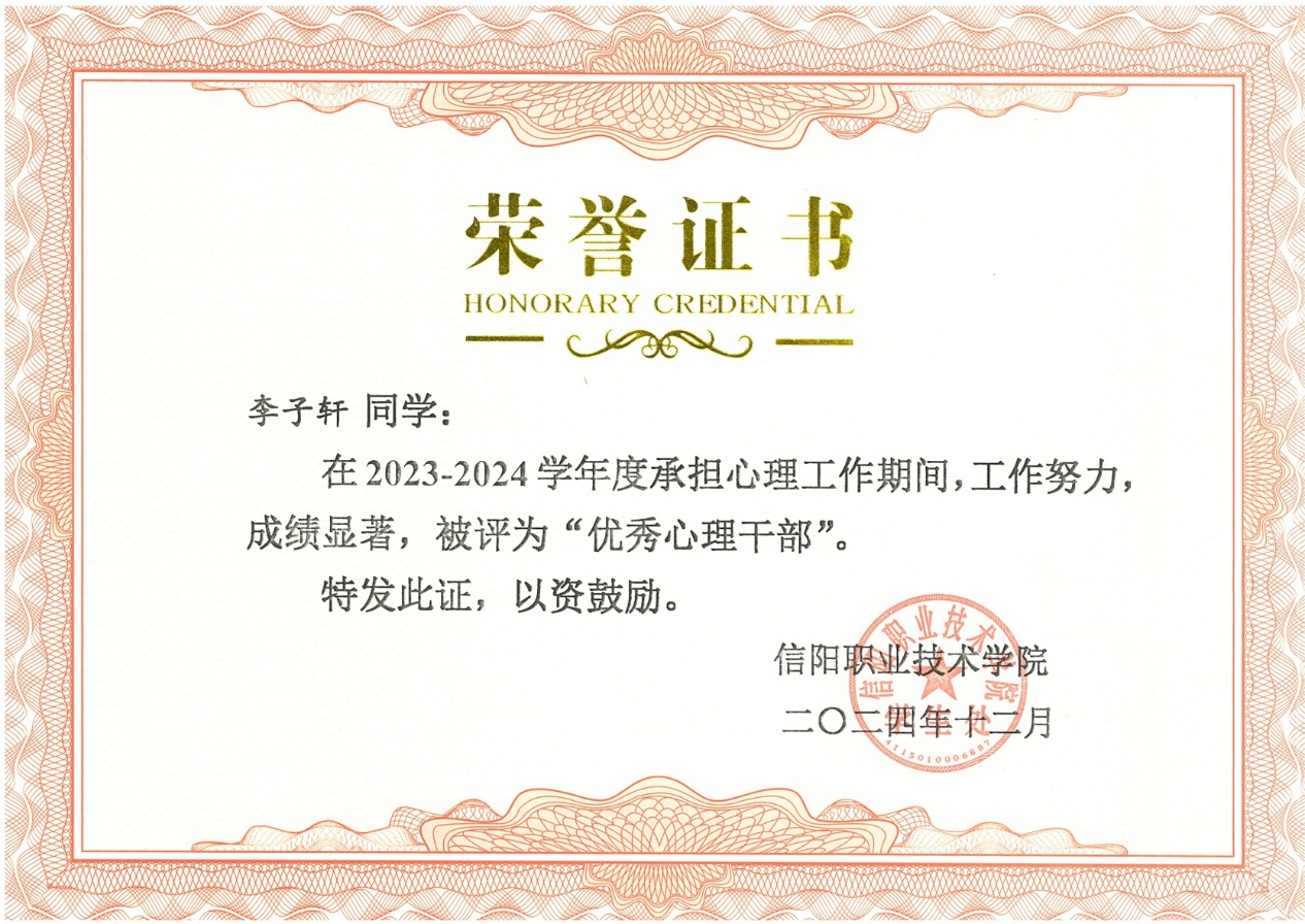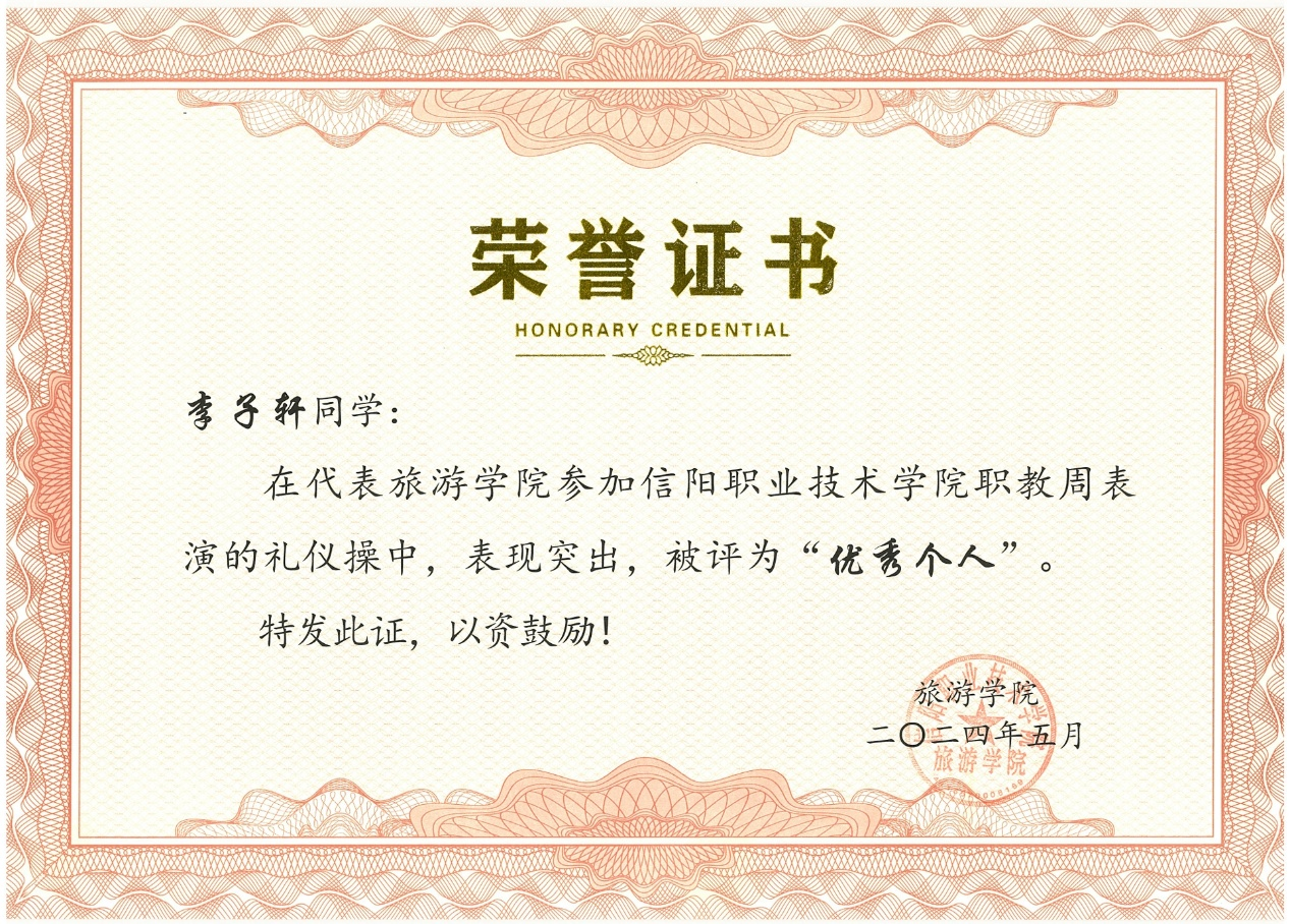 个人简介:李子轩,女,共青团员,304永利集团23级旅游管理专业员工,在校期间多次获“优秀个人”“优秀心理干部”“公益活动先进个人”“志愿服务先进个人”荣誉称号,获2024年一带一路暨金砖国家技能发展与技术创新大赛首届心理健康与职业发展(AI赋能)赛项决赛“优秀奖”。