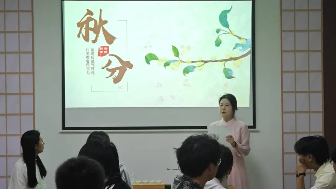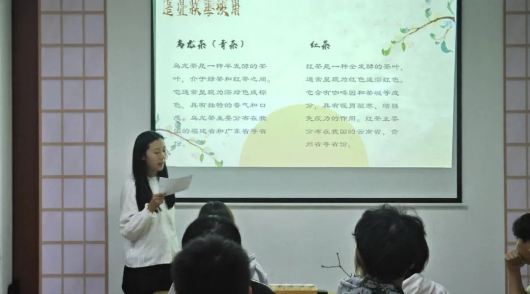 清雅茶艺社指导老师赵佳敏老为茶文化爱好者们讲解秋分与茶的关系,如秋分时节适合饮用的茶类、茶叶的养生功效等。秋分时节最适宜饮用乌龙茶、红茶。因为乌龙茶性味介于绿、红茶之间,不寒不热,既能消除体内余热,又能恢复津液;红茶性热,能够暖胃养胃。