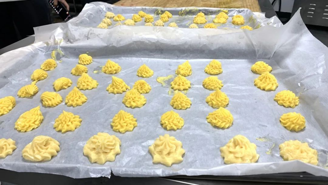 把挤好面糊的烤盘放入预热好的烤箱,随着温度上升,它们开始慢慢膨胀,外皮逐渐变得金黄酥脆,散发着诱人的香气。