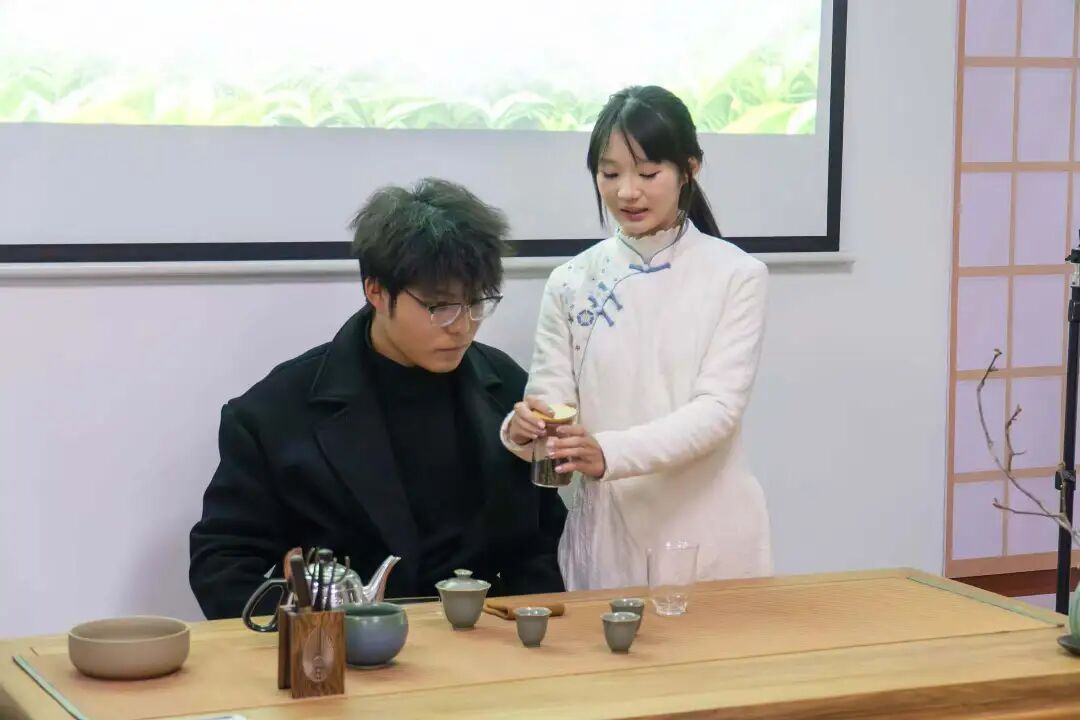 互动环节暖意融融,茶师耐心细致地手把手教导学子们冲泡技巧,从置茶量拿捏、水温把控,到出汤节奏,倾囊相授。学子们踊跃尝试,在实操乐趣中解锁茶艺技能,深悟茶文化的底蕴。