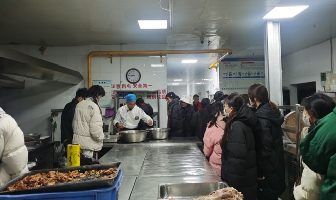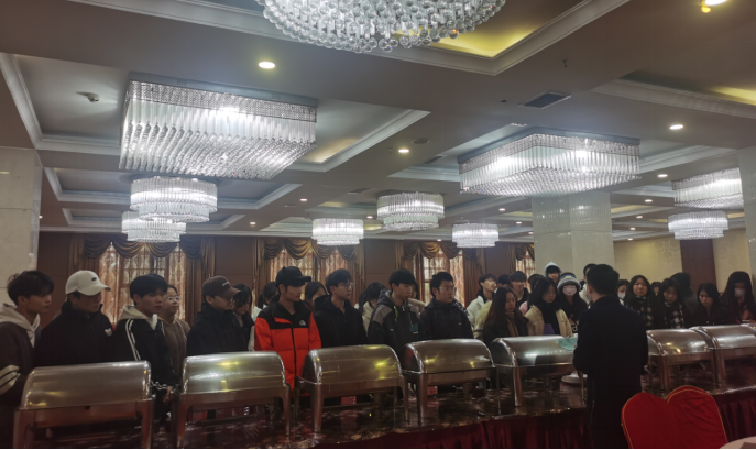然后,观摩餐饮部门工作,听取了关于自助餐服务的细节讲解,参观了酒店后厨、传菜岗的工作环境,感受了包厢餐饮服务的工作规范和重点。