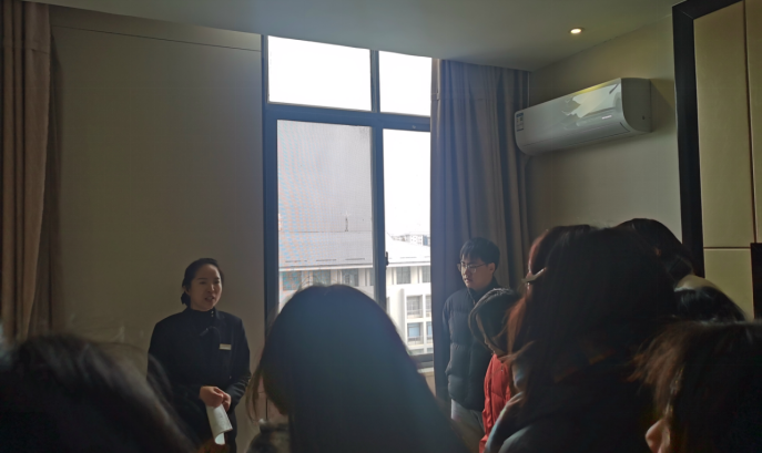 员工在大厅集合后便开启实训观摩,学习内容主要涉及三个部门:前厅部、餐饮部和客房部。