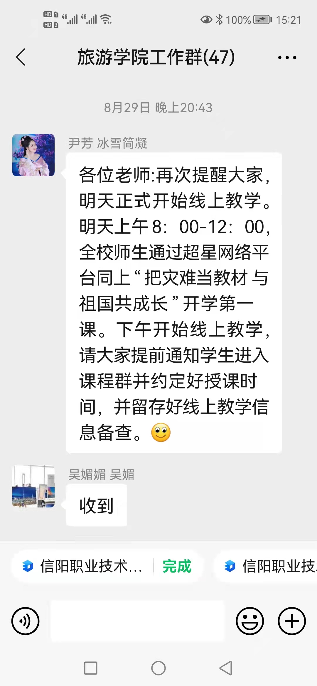 8月30日-9月3日,全院共16位任课教师完成了19个班级共51门次课程的线上教学,其中智慧树平台上课13人次,钉钉平台直播教师3人次,员工平均到课率 93.84%。任课教师们能够根据课程安排充分准备,按时进入网络教学平台开展教学,教学过程中注意融入课程思政,加强师生互动。第一周线上教学整体运行有序。